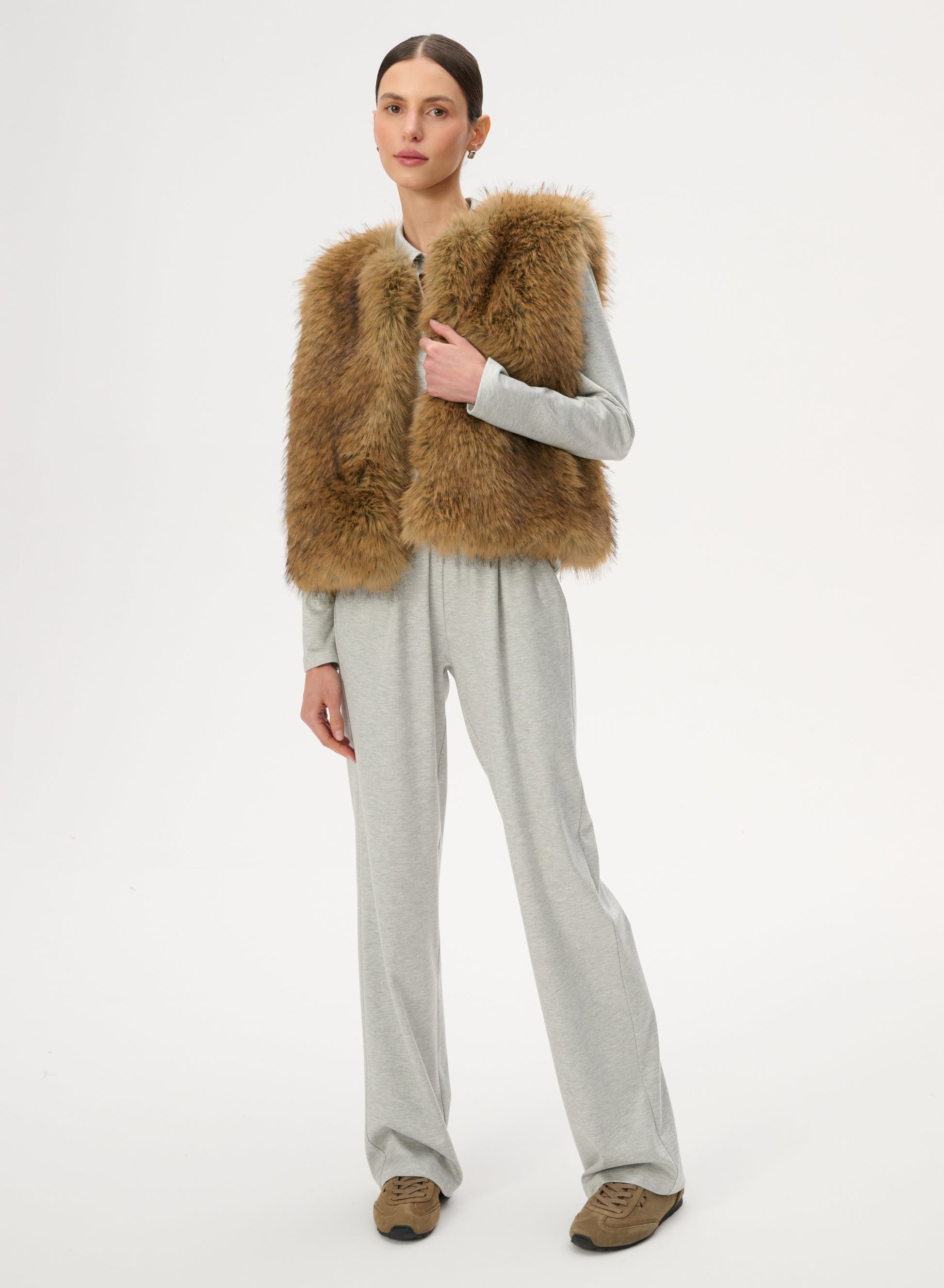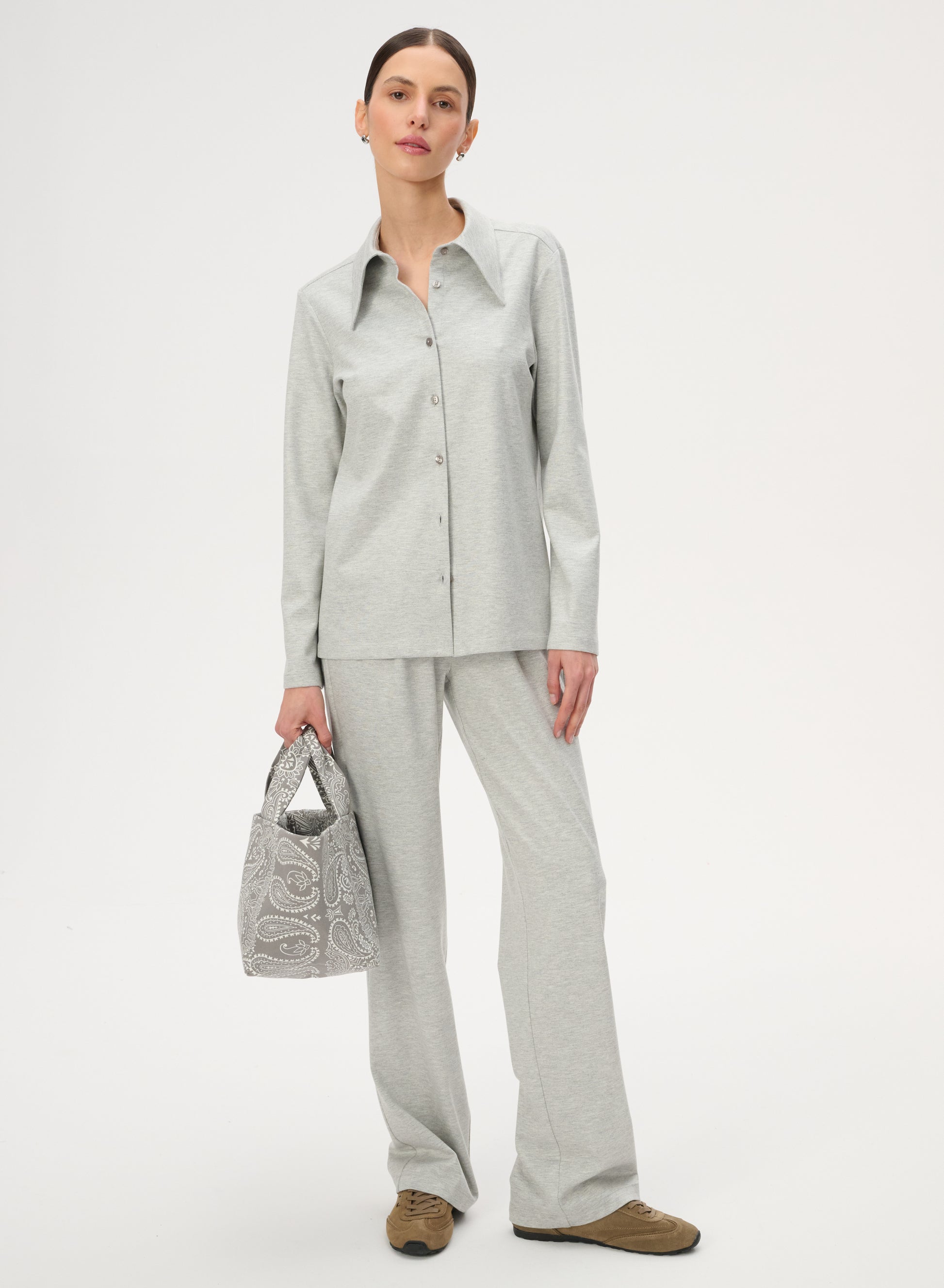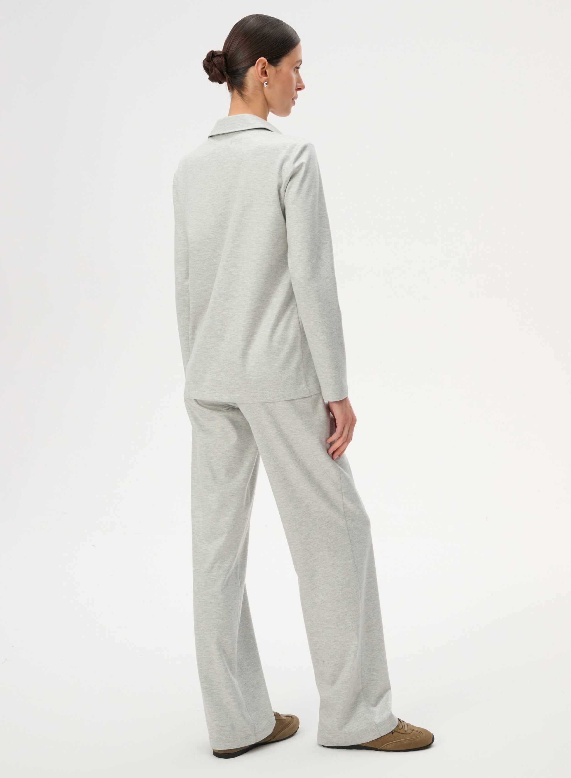 Spodnie o prostej, długiej nogawce. Wykonane z lekkiej dzianiny w kolorze jasnoszarym. Posiadają podwyższony stan z elastycznym pasem oraz dwie kieszenie.