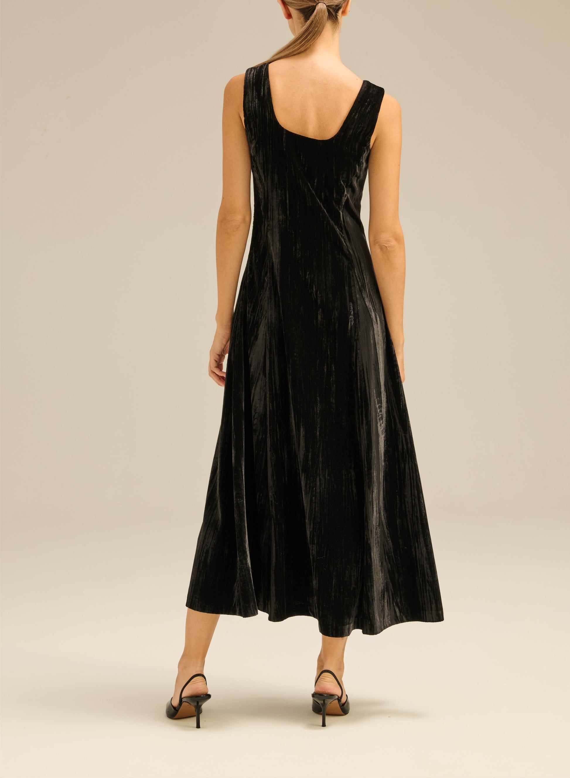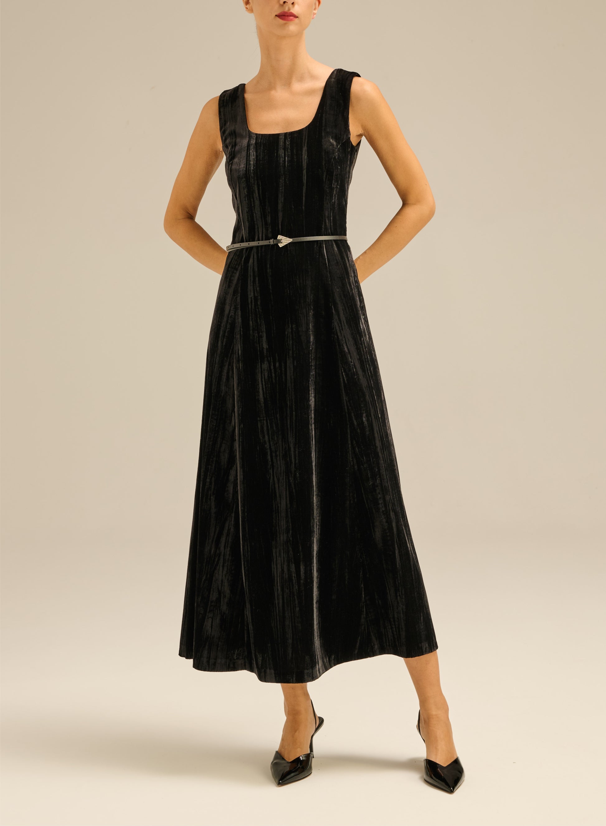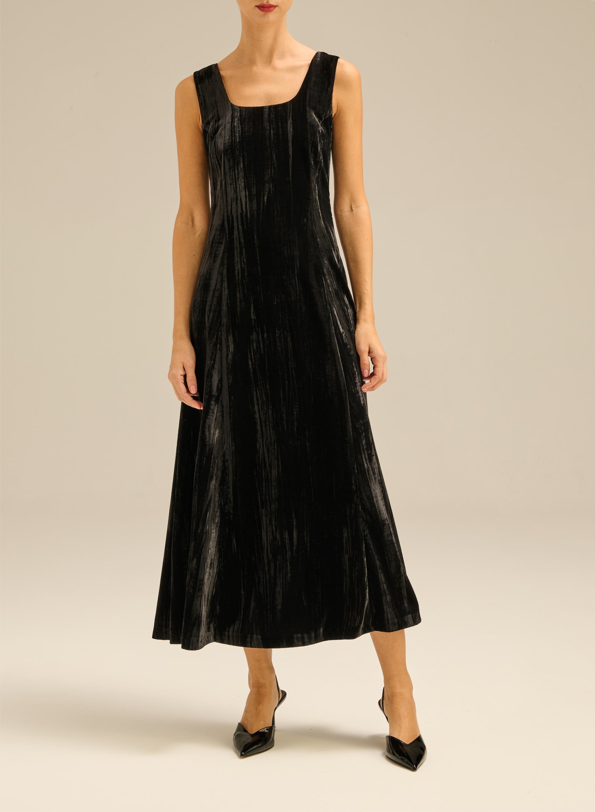 Елегантне плаття в мінімалістичному стилі з м'якого, злегка блискучого велюру. Має більш товсті бретелі, прямокутний виріз і розкльошений низ.
