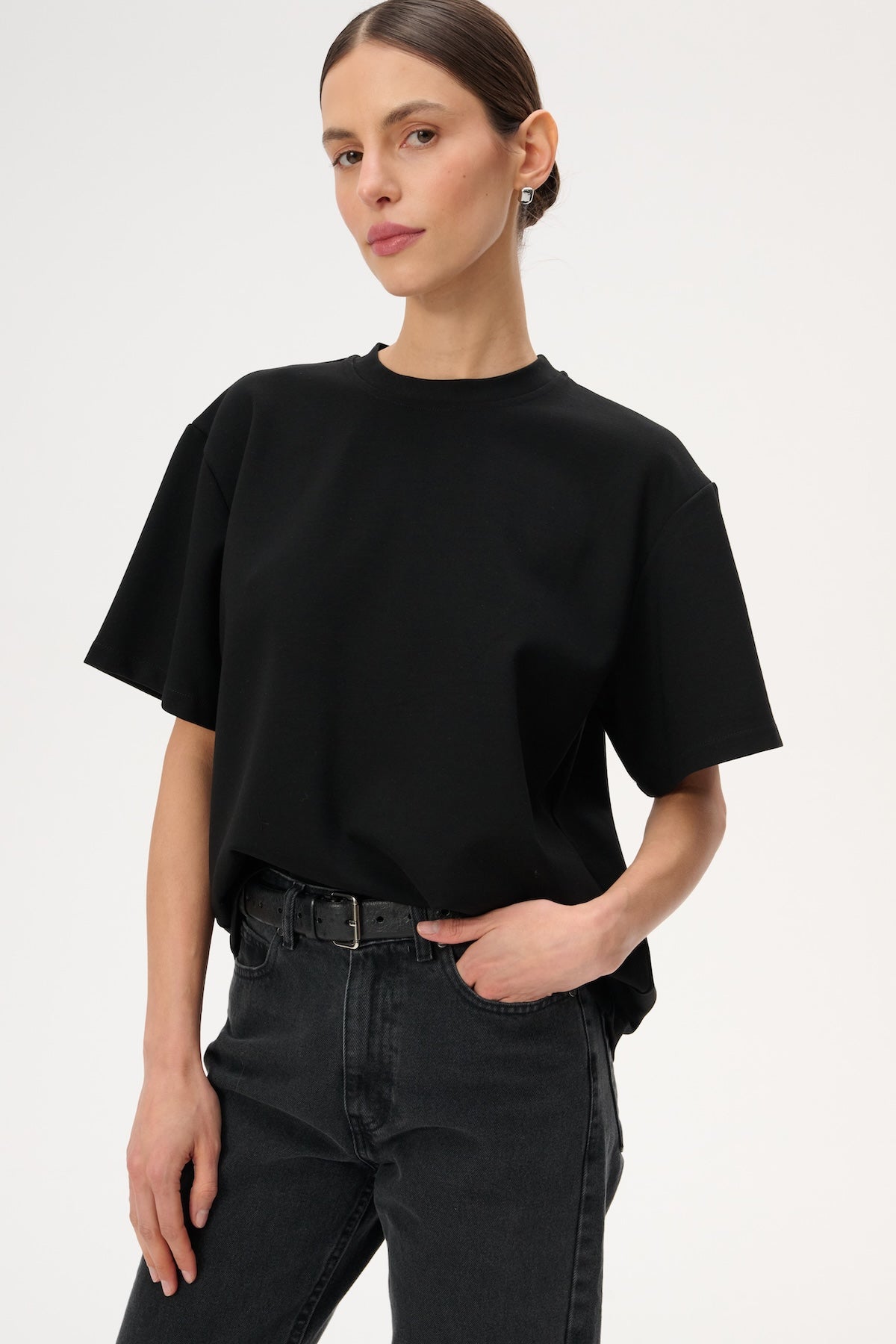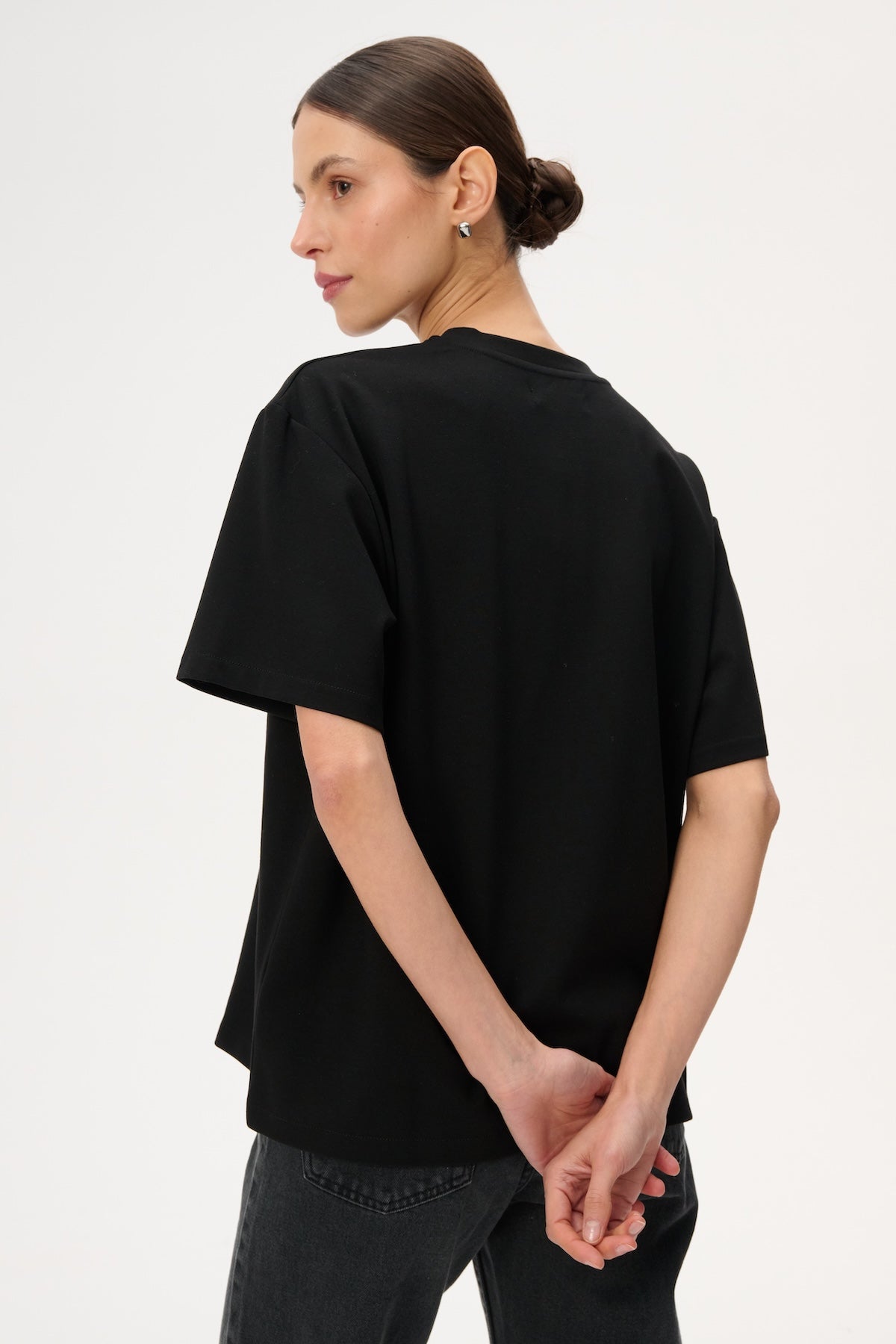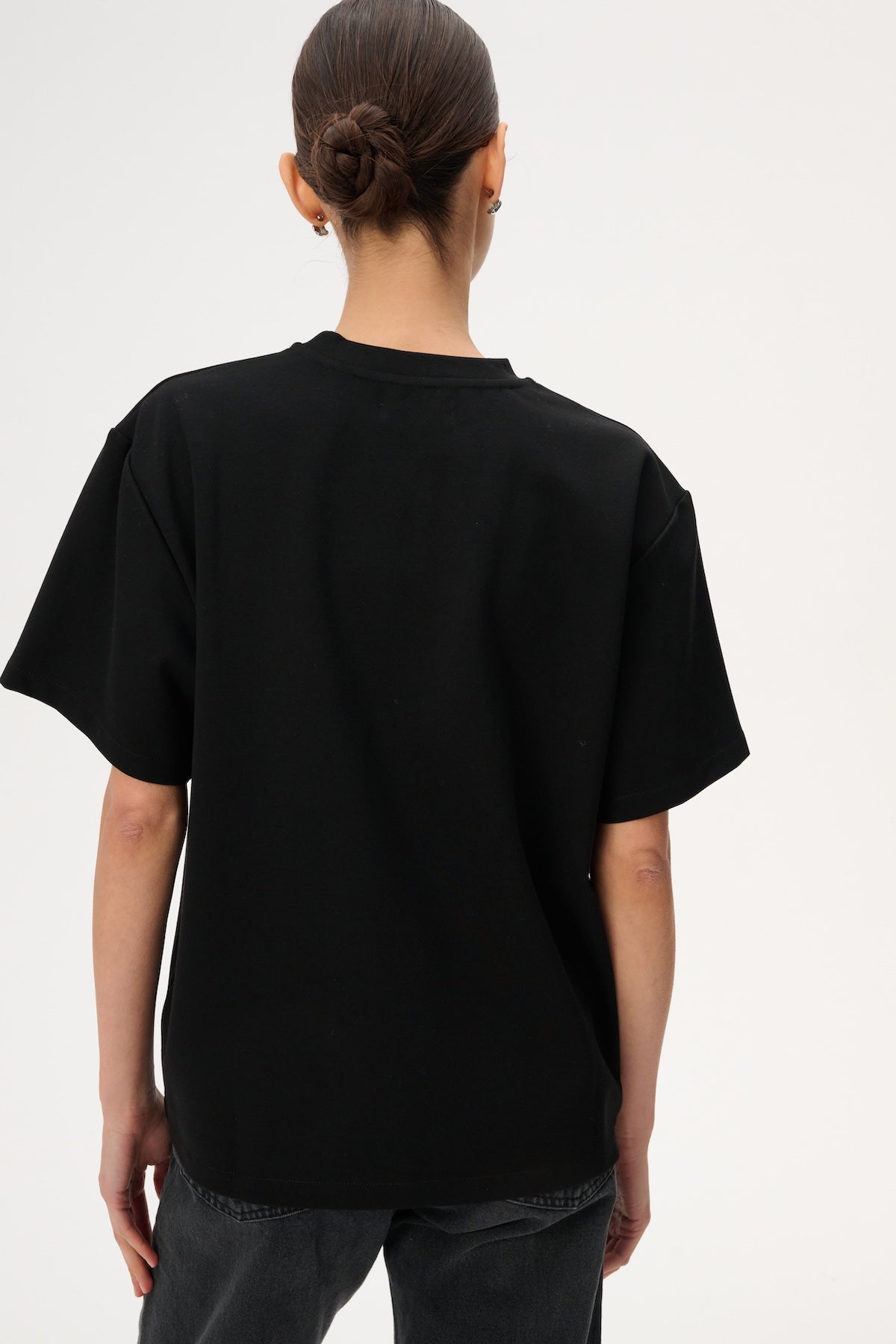 Футболка oversize з м'якого трикотажу. Має круглий виріз і рукава до ліктів.