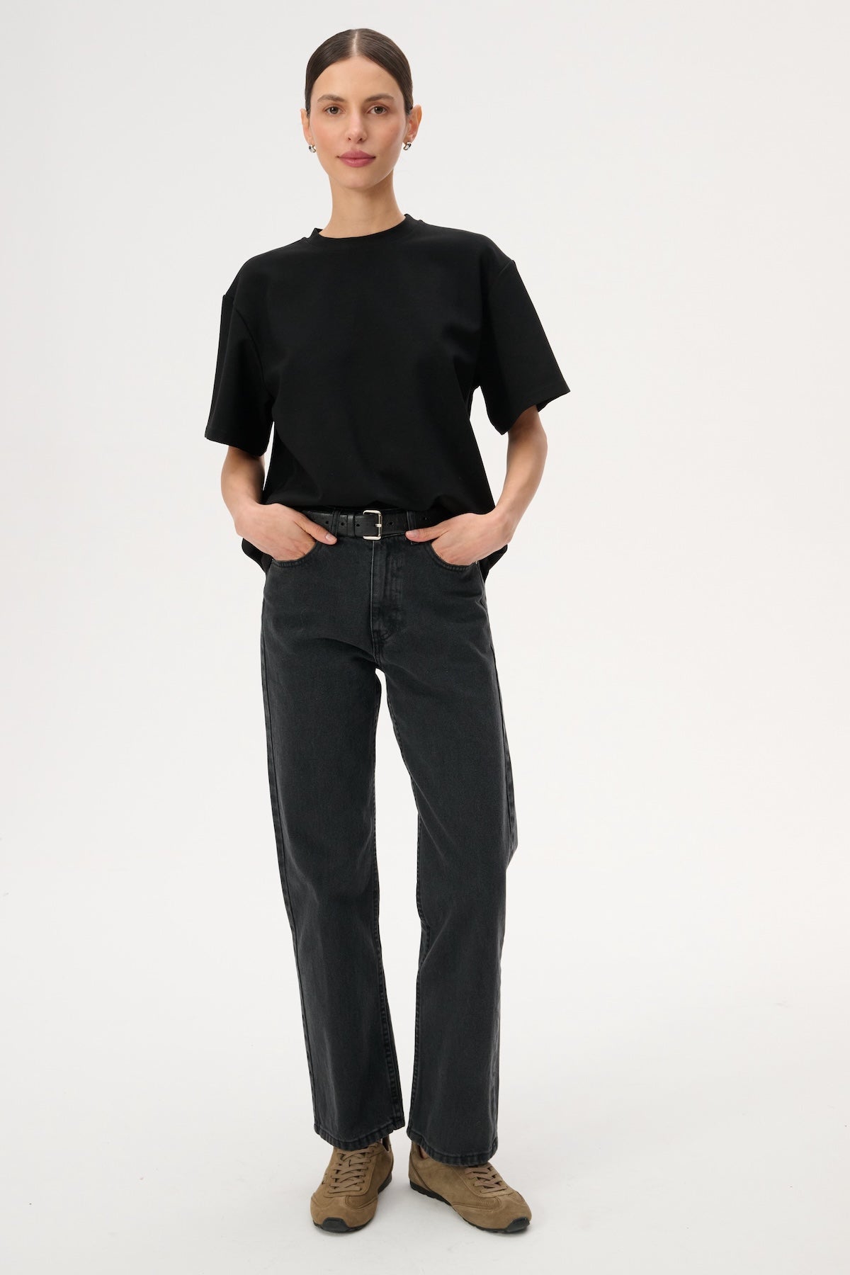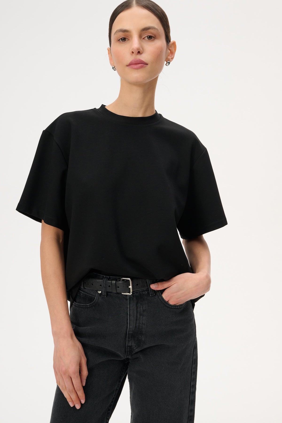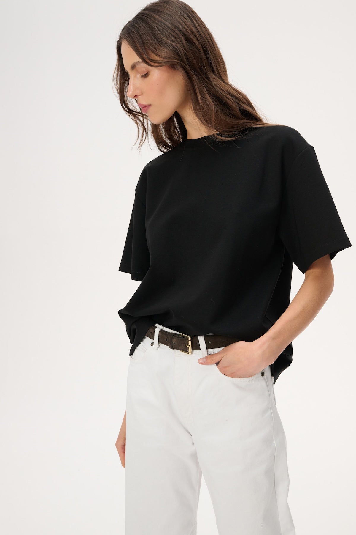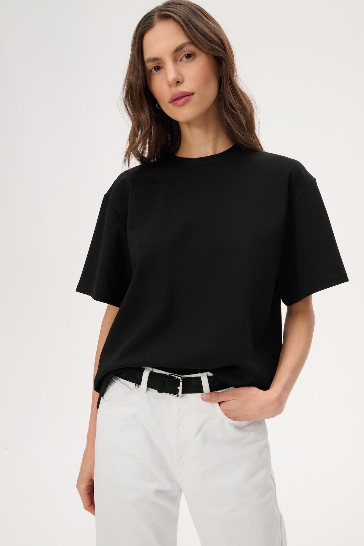 Футболка oversize з м'якого трикотажу. Має круглий виріз і рукава до ліктів.