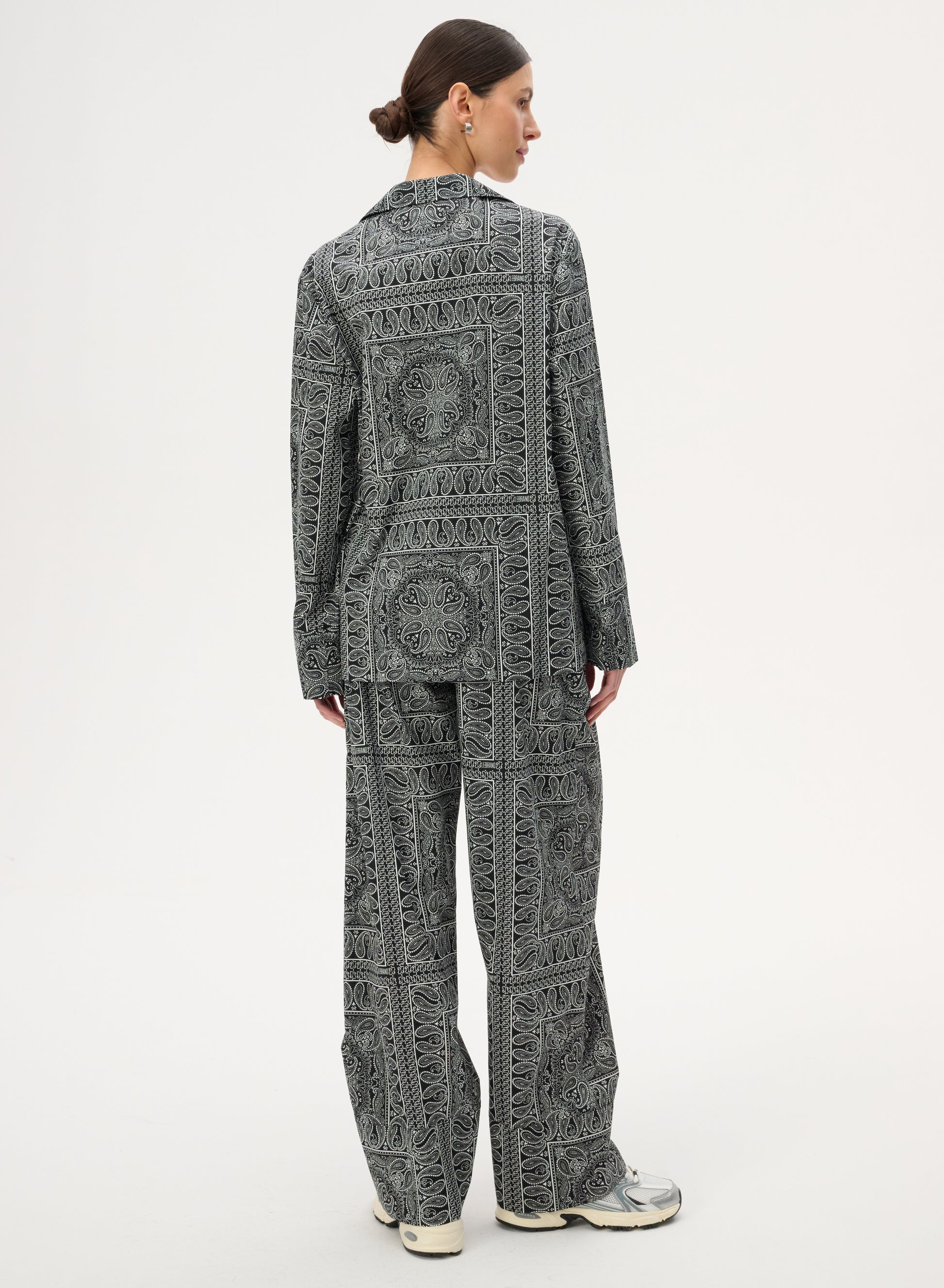 Комплект, що складається з сорочки Julien і штанів Roy. Виготовлений з бавовни з принтом з впізнаваним візерунком бандана. Сорочка має крій оверсайз, штани мають еластичний пояс і широкі штанини. У разі можливого повернення набір необхідно повернути в цілому вигляді